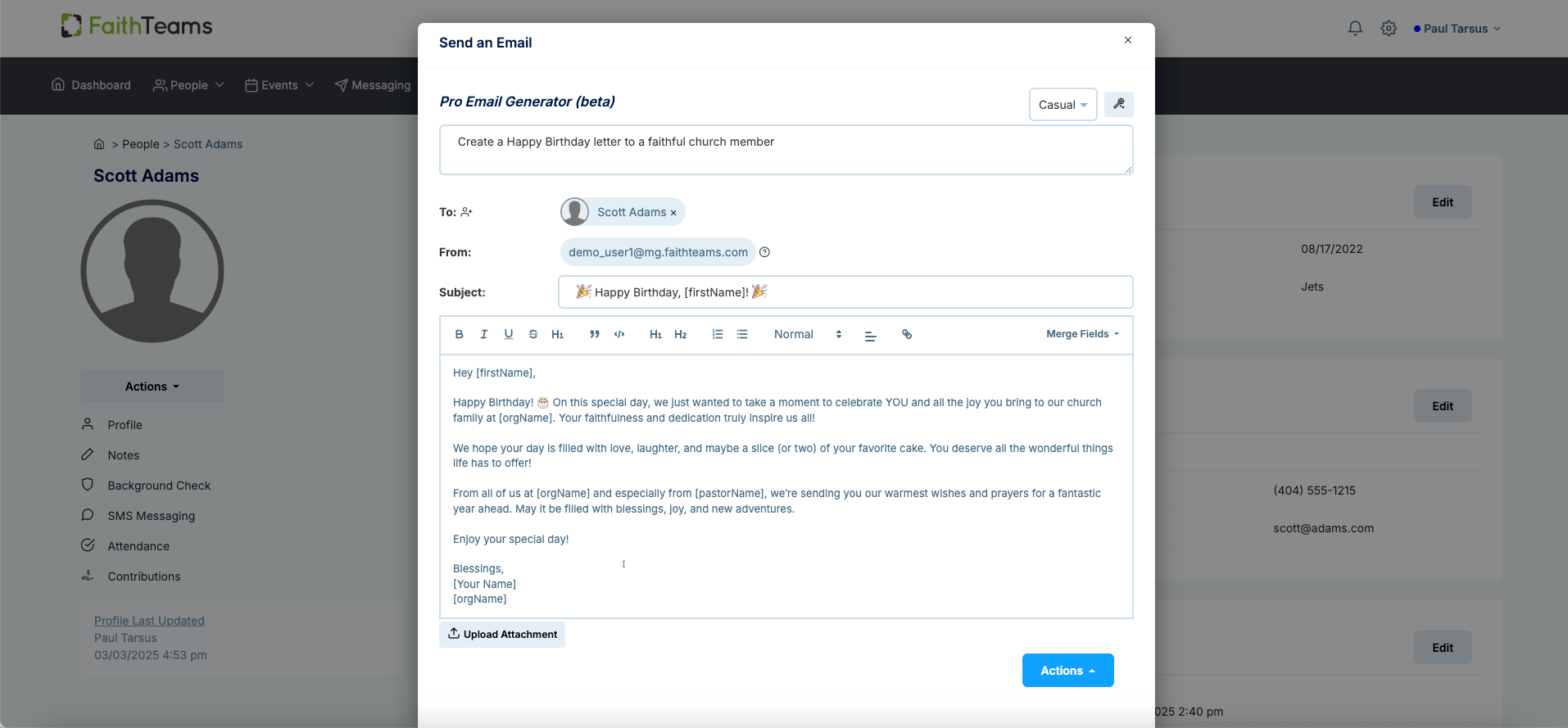Faith Teams will generate not only text for your email. It will also create merge fields in the right places and add emoji’s where appropriate. And you are still in charge. Edit the email as you see fit and either send to your list of people or save the template you were creating.